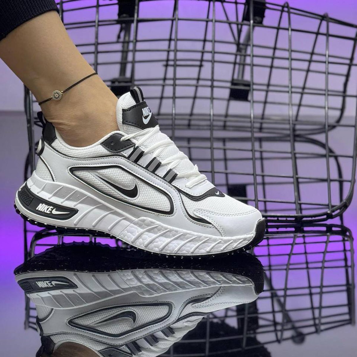 Открийте перфектната комбинация от модерен дизайн и високо качество с тези мъжки маратонки Nike в бяло и черно. Изработени от дишаща мрежеста материя и подсилени с устойчиви синтетични елементи, те осигуряват отлично прилягане, стабилност и комфорт през целия ден. Подходящи както за спорт, така и за ежедневна употреба. Гумената подметка с добро сцепление гарантира сигурна стъпка на всякакви повърхности.
